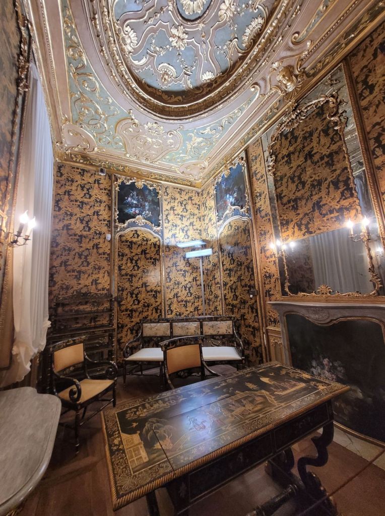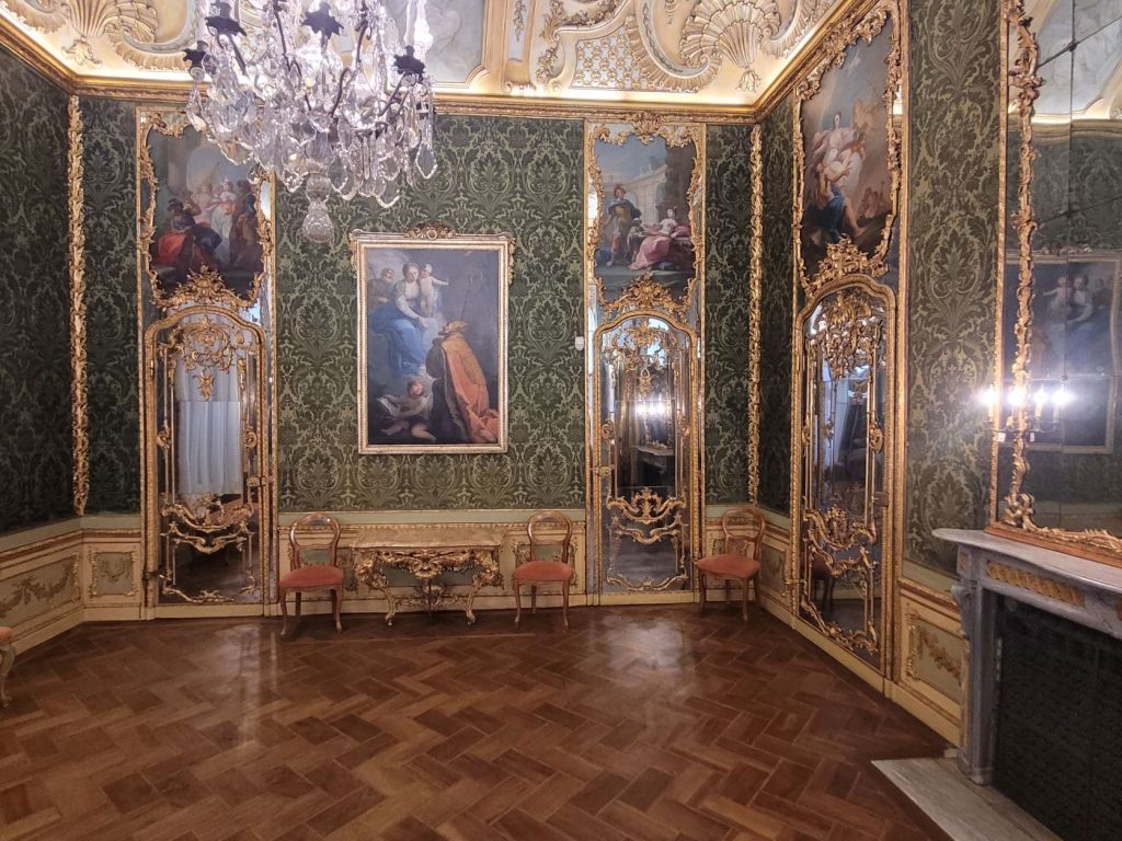 Ci sono gli ambienti caratterizzati dallo stile barocco e poi dall’ancora sontuoso gusto rococò. Ne è un esempio la Sala degli Specchi, con le sue asimmetrie e le finte porte e il gabinetto cinese, particolareggiato e meraviglioso.