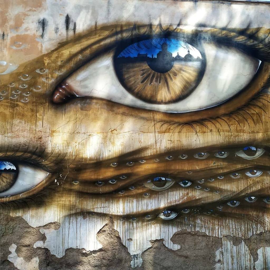 Uno dei murales più belli di Trastevere è quello che rappresenta decine di occhi che sembrano osservare senza scampo lo spettatore. Si trova proprio a due passi dall’area giochi, perfetta per una sosta se avete bambini e vicinissimo alla prossima tappa che vi racconto.