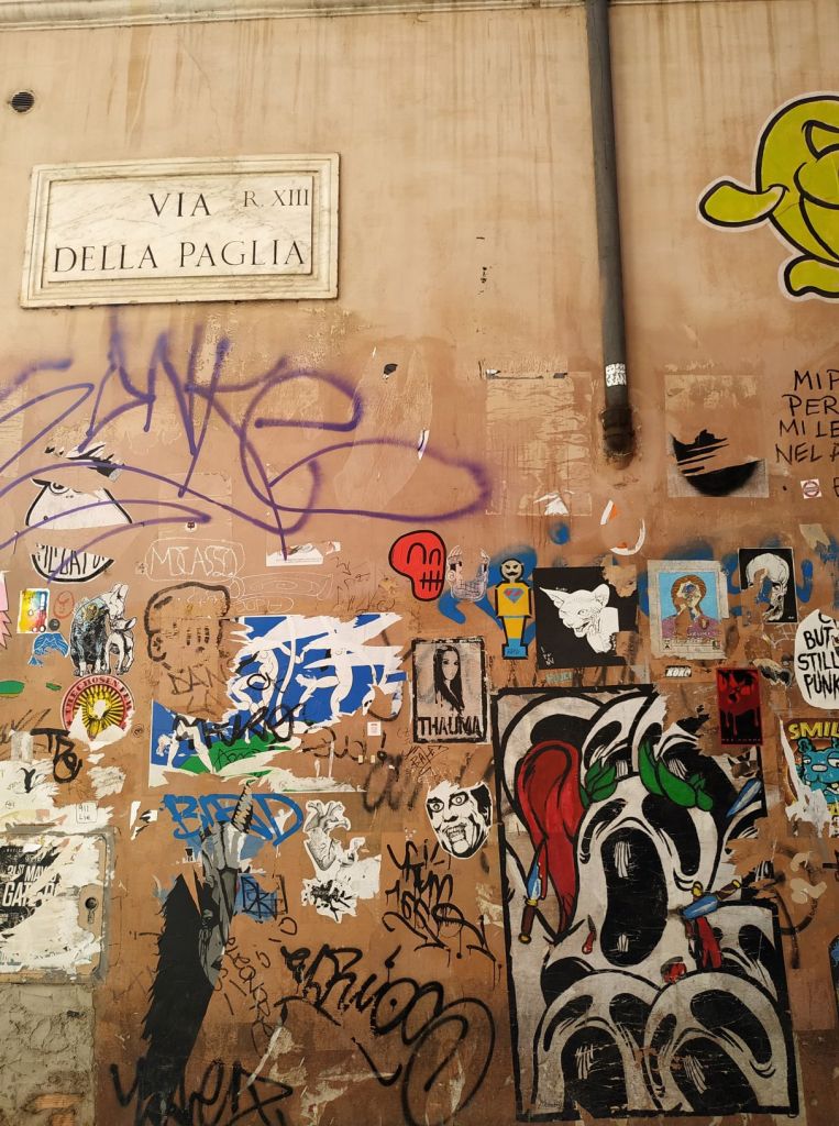 Via della Paglia è piena zeppa di sticker art. Ma non è l’unica di Trastevere