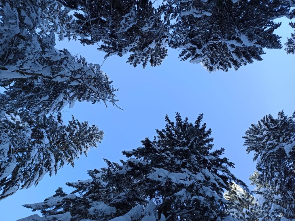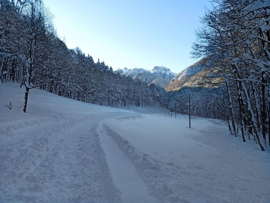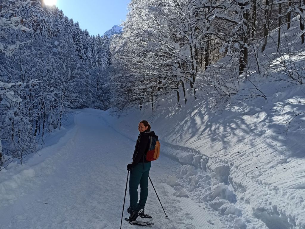Attraversate il ponte e superate il piccolo villaggio residenziale che, innevato, ricorda una cartolina d’altri tempi. Il sentiero vi condurrà oltre ad un altro spiazzo che, in estate, è un’area attrezzata. Man mano camminando vi inoltrerete sempre più tra i boschi, dove incontrerete i primi abeti bianchi. Se siete fortunati, il sole inizierà a fare capolino dietro alle montagne tingendo il bosco e la neve di caldi riflessi dorati.