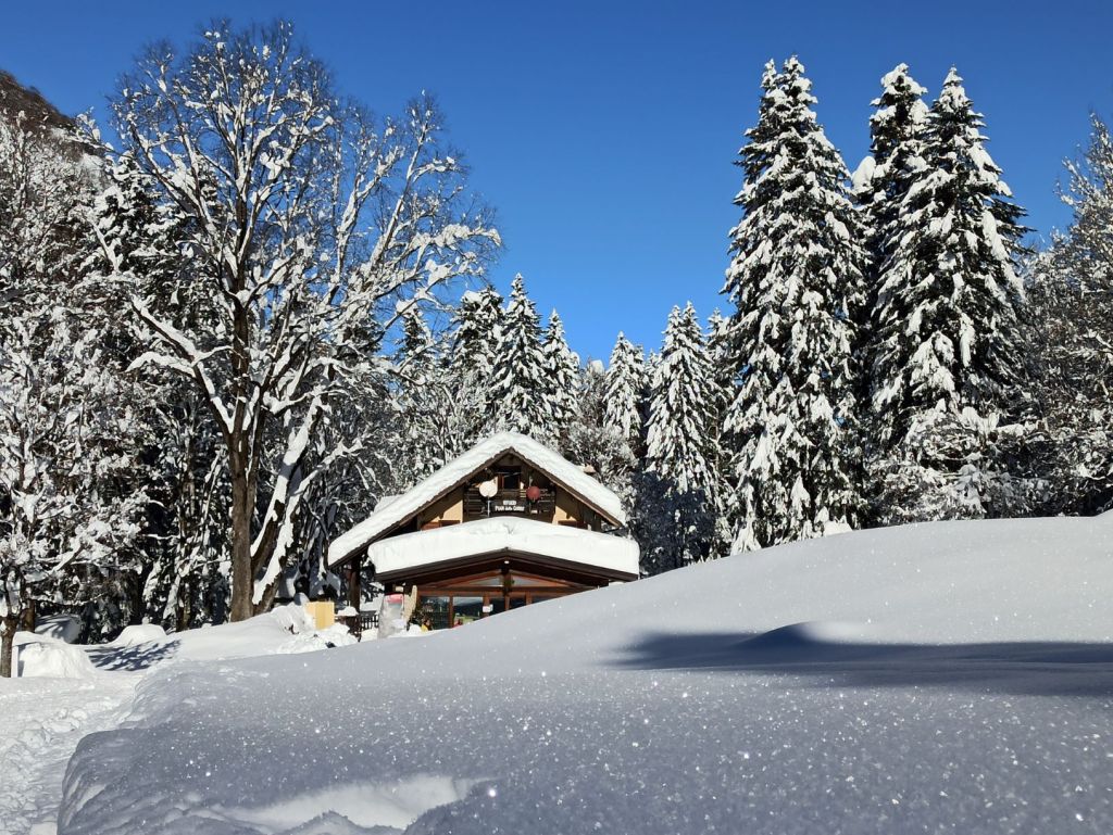 In meno di dieci minuti si aprirà davanti a voi un vero e proprio spettacolo per gli occhi. Ai piedi delle vette innevate, una scintillante distesa bianca avvolge il piccolo rifugio e la sua magnifica corona di abeti.