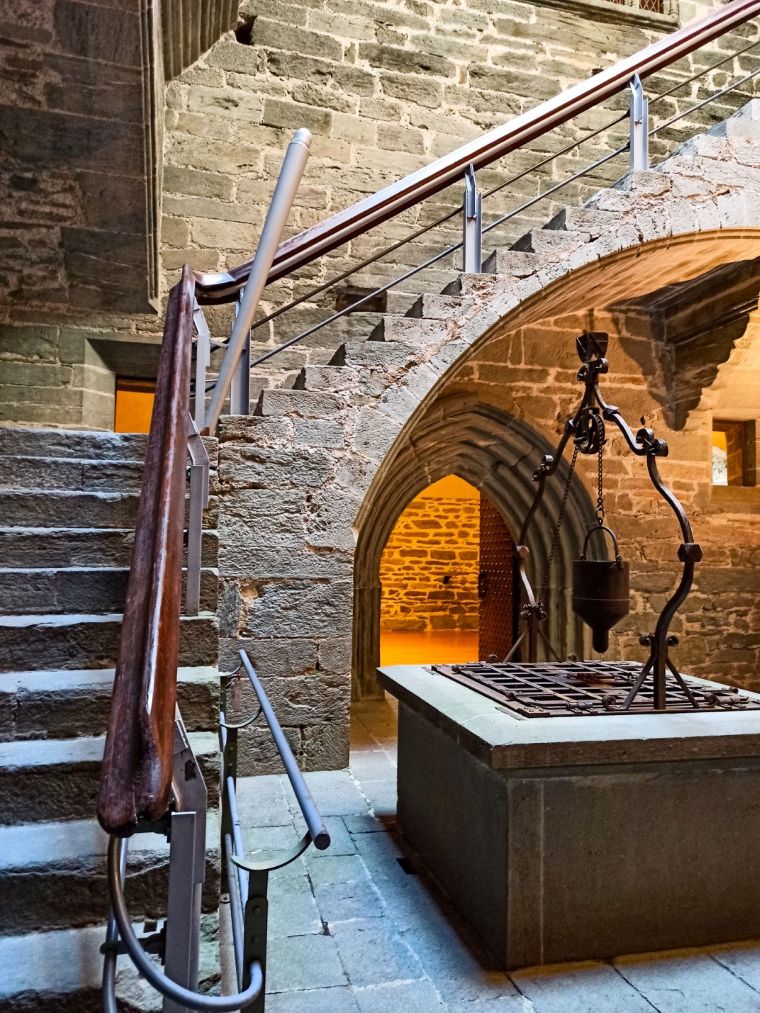 Si prosegue salendo il magnifico scalone in pietra che adorna il cortile, raggiungendo il primo piano, un tempo ad uso esclusivo dei nobili. Durante la visita si possono ammirare le sobrie stanze private dei signori, la cucina padronale con un grande camino di 22 metri utilizzato per cucinare la selvaggina intera e l’imponente sala da pranzo.