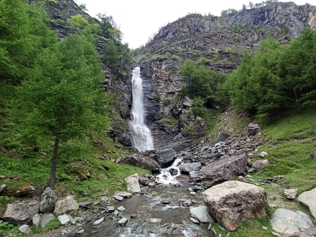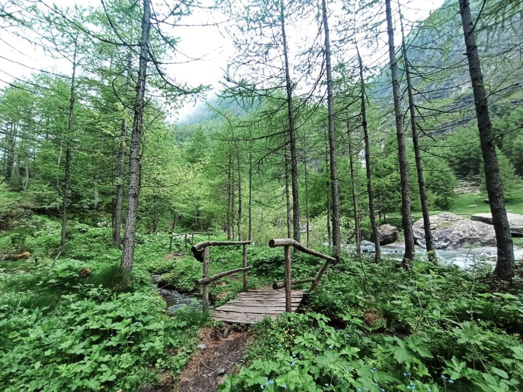 Tutto d’un tratto il sentiero si fa pianeggiante e si immerge in una piccola radura, tra l’erba verdissima, proprio accanto al letto del Pellice. Proprio sul fiume incontrerete un piccolo ponte sospeso, particolarmente malconcio, che un tempo permetteva di attraversare il fiume e raggiungere la carrozzabile. Proseguite attraversando il ruscello sulla destra del masso che conduce al ponticello. Lungo questo tratto potrete ammirare, sulla vostra destra, dall’altro versante l’incantevole Pian dei Morti ed alle sue spalle l’imponente Cascata del Pis.