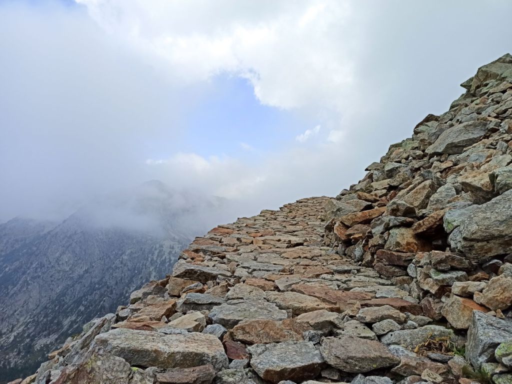 In una ventina di minuti raggiungiamo un colletto e, qui, il paesaggio attorno a noi muta. Siamo in una grande pietraia, la nebbia salendo inizia ad avvolgere le cime attorno a noi, creando un’atmosfera estremamente suggestiva e ci ritroviamo in uno dei punti più fotografati del percorso. Qui, più di cent’anni fa i soldati hanno creato un capolavoro di ingegneria. Una via lastricata a più di 2000 metri, perfetta ed incredibilmente armoniosa, creata con grandi massi dai colori scarlatti. Un’opera che forse oggigiorno non saremmo più in grado di ricreare.