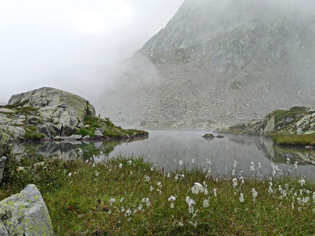 Noi cerchiamo un fazzoletto d’erba sulla riva e ci godiamo il meritato pranzo davanti a questo spettacolo della natura. Ci concediamo una mezz’ora di pausa per recuperare le forze, il grosso è stato fatto, abbiamo già raggiunto i 900 metri di dislivello. Ma il vento soffia forte e la temperatura non è delle più calde, siamo pur sempre a 2274 metri sul livello del mare, quindi riprendiamo lo zaino e non indugiamo oltre.