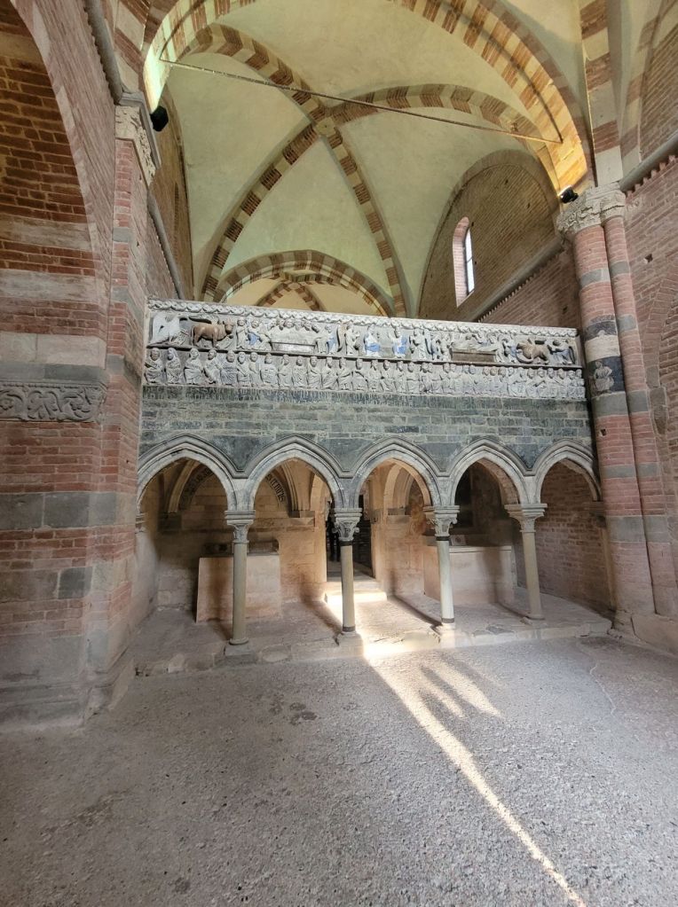 Una delle parti più incredibili e affascinanti dell’Abbazia è il pontile, una rara struttura che attraversa la chiesa all’altezza della prima campata e che ammirerete appena entrati. Il pontile è realizzato in arenaria grigia del Monferrato dipinta, con colonnine in pietra e bassorilievi bassorilievi policromi che raffigurano le scene della Dormitio. Particolareggiato e insolito, impedisce la vista della Chiesa nella sua interezza e dell’Altare.