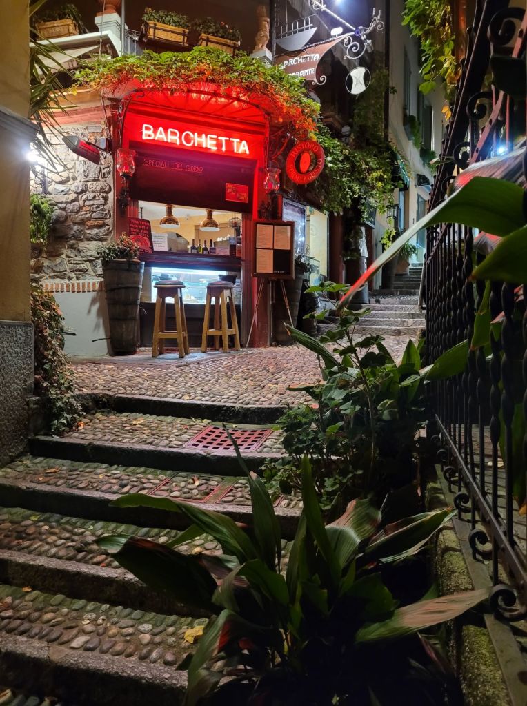 Bellagio di sera è incantevole. L’abbiamo visitata in autunno, praticamente in solitudine, con le luci dei negozi accesi, i localini curati e deserti. L’abbiamo immaginata in estate, affollata, con un drink in mano e musica dal vivo.