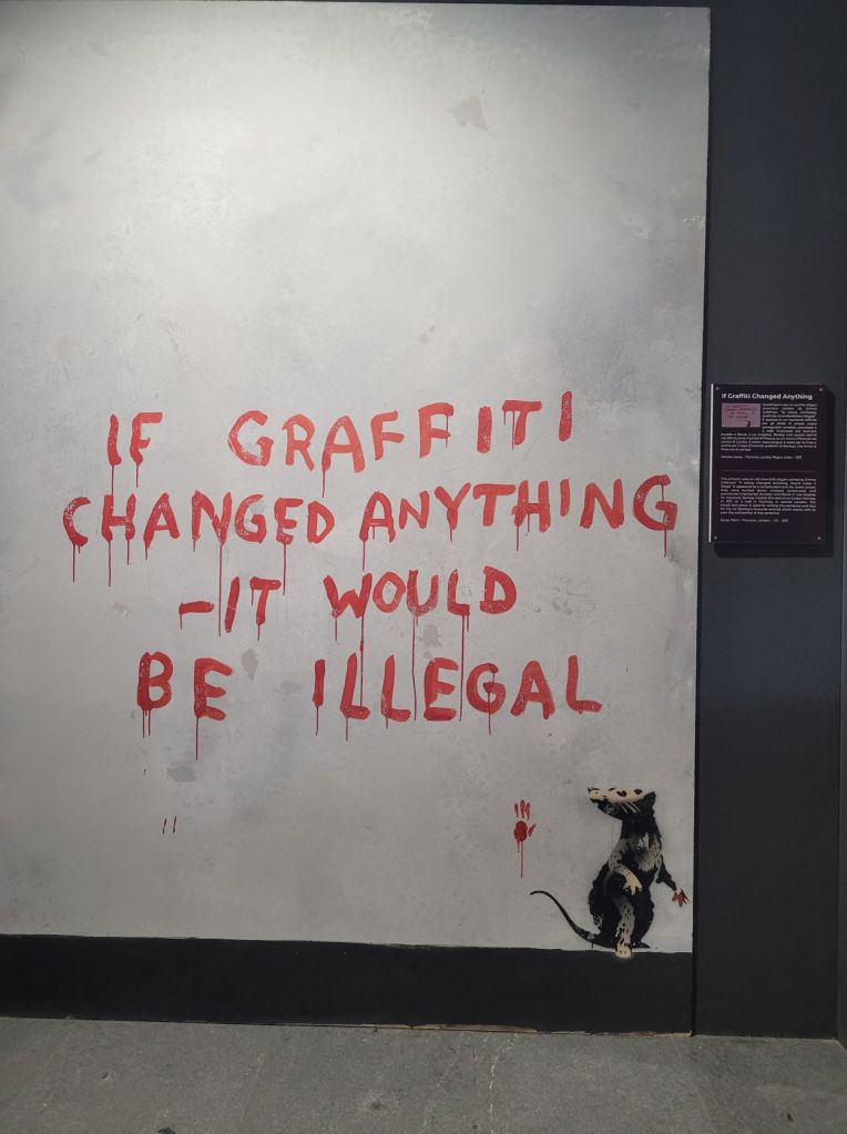 Perché se nella realtà i graffiti celeberrimi compaiono dall’oggi al domani sulle pareti degli edifici più disparati, quasi sempre creati con il favore della notte, è particolare che anche qui le opere compaiano a grandezza naturale, come se il visitatore si svegliasse in una via trafficata di Londra o Boston e si ritrovasse, per sua fortuna, a passeggiare tra murales e graffiti di Banksy.