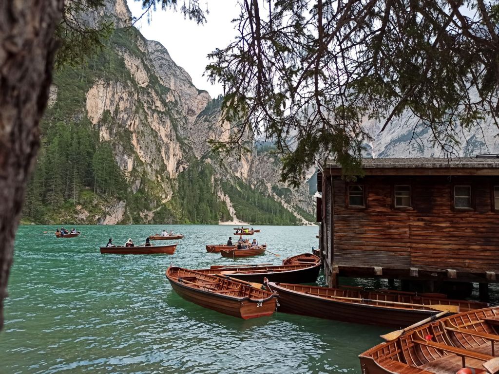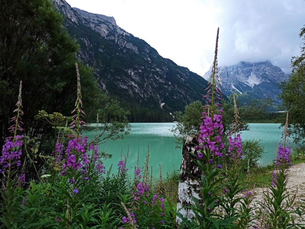Giornata grigia, decidiamo di andare alla scoperta della Val Pusteria, superiamo Cortina d’Ampezzo e facciamo una piccola pausa al bellissimo Lago di Landro. Un ampio Lago dalle sfumature latte-menta, proprio accanto alla strada.