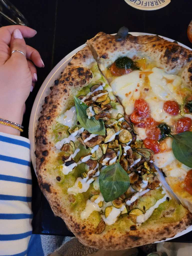 La pizza, cotta in forno elettrico, ha scalato in fretta le classifiche internazionali, con ingredienti cocciuti: materie prime ottime, accostate in modo sapiente ma mantenendo la semplicità, che paga sempre. Noi come al solito abbiamo fatto metà a testa ed entrambe le pizze scelte, una Margherita Cocciuta e una Nerano, erano ottime.