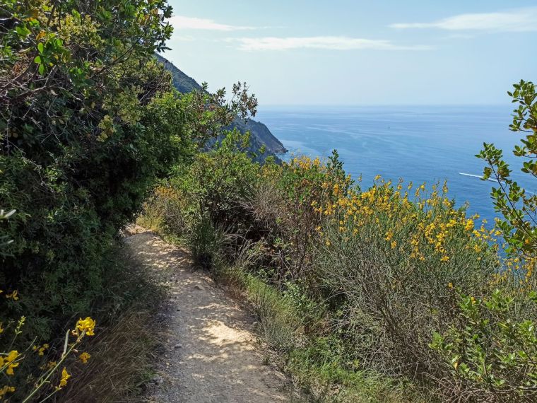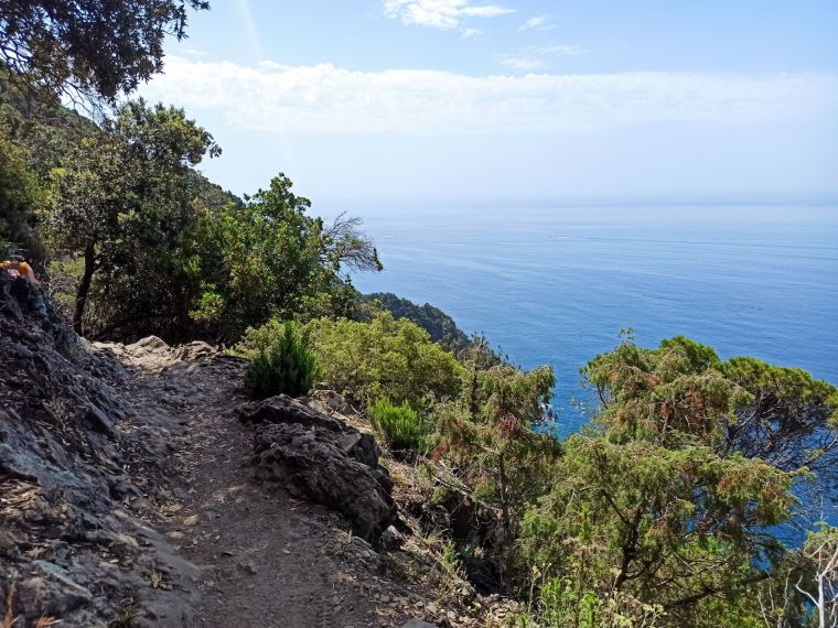 La strada lastricata dopo pochi minuti si trasforma in un piccolo sentiero lungo un meraviglioso balcone naturale. Camminare in questo tratto è piacevolissimo, ci si ritrova all’ombra della macchia mediterranea, accompagnati dal canto delle cicale, dove il profumo dei fiori si mescola a quello delle erbe aromatiche che naturalmente crescono su questo pendii, e davanti a voi un paesaggio davvero mozzafiato, qui le scogliere liguri si gettano in un mare turchese e cristallino.