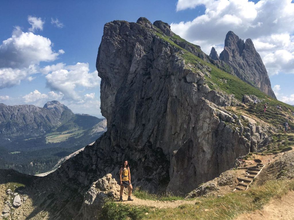 Arriviamo in cima e rimaniamo estasiate dalla vista: sotto ai nostri piedi la montagna scende quasi a strapiombo per chilometri, alla nostra destra svettano impetuose le cime delle Odle e, tutto intorno a noi, si scorgono in lontananza le vette delle Dolomiti.