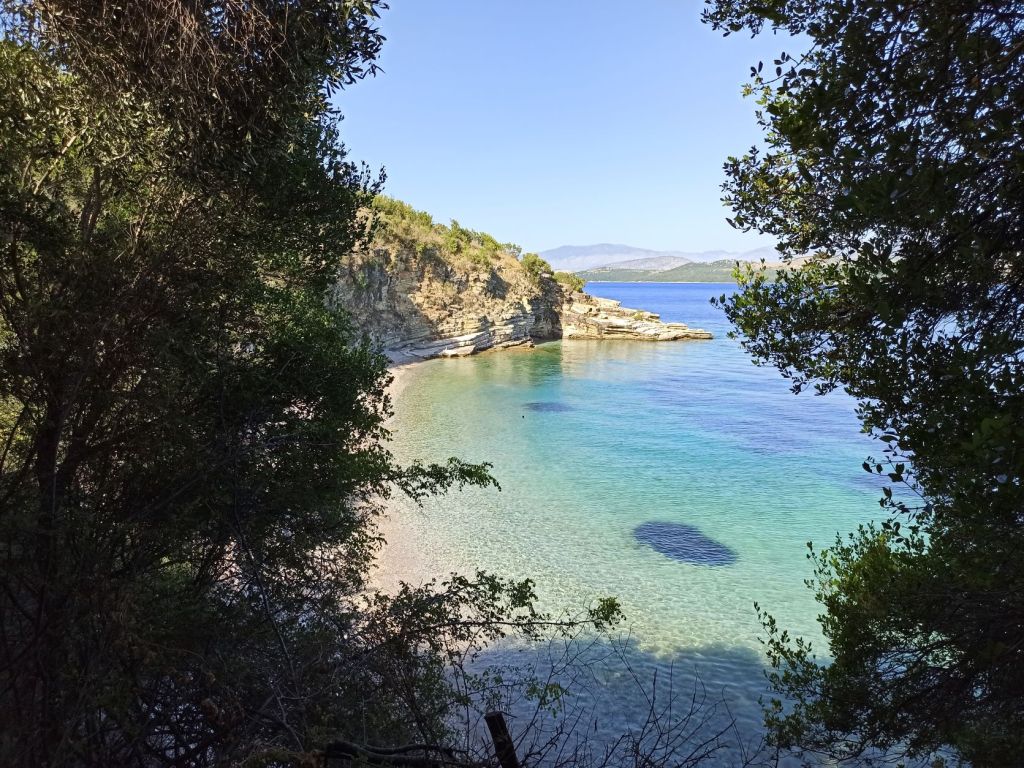 Per smaltire il grande piatto di sardine fritte ci incamminiamo lungo il sentiero che sale sulle scogliere sulla destra del ristorante. Ci ritroviamo a passeggiare lungo uno stretto sentiero ai piedi di affascinanti ulivi secolari, accompagnate dal canto delle cicale. Qua e là appaiono tra gli alberi scorci di mare e si intravedono sentieri che portano a calette nascoste. Raggiungiamo in poco tempo la punta del promontorio dominata da un ulivo solitario e dal tronco biforcuto, davanti a noi in lontananza ammiriamo le barche che scorrazzano sulle onde e sullo sfondo la costa dell’Albania. Incuriosite, continuiamo lungo il sentiero fino a raggiungere una tranquilla baia, che dà l’accesso via mare ad una lussuosa tenuta privata. Rimaniamo un po’ qui a contemplare la calma di questa baia meravigliosa.