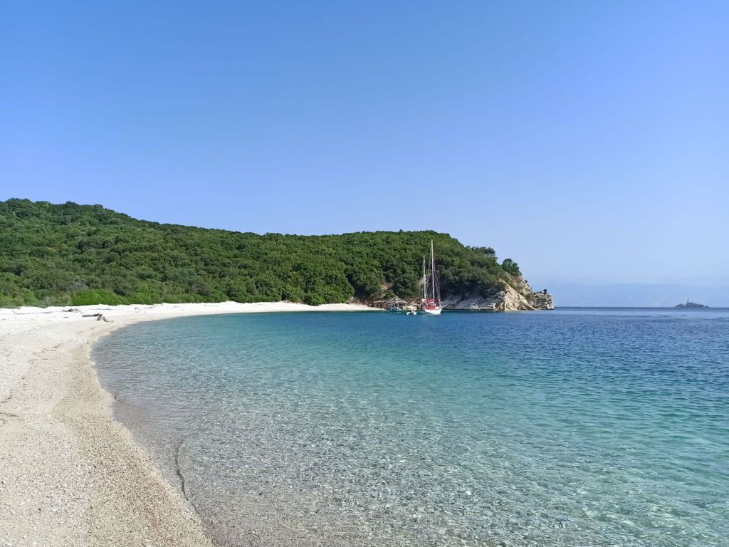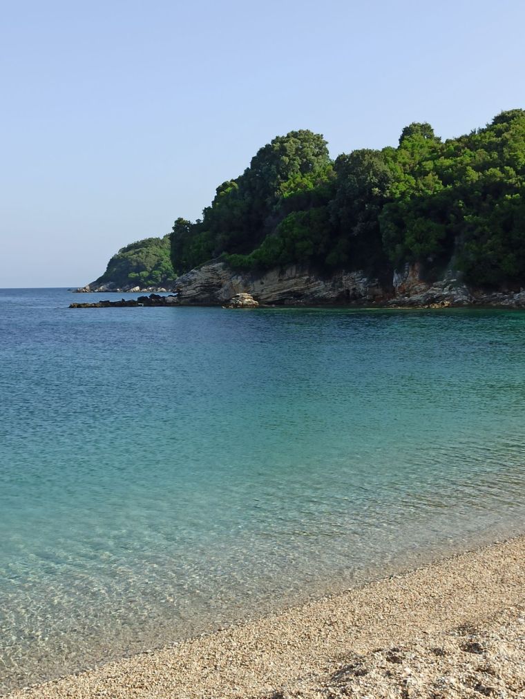 Una piccola spiaggia attrezzata di ciottoli, protetta dalla baia di Kerasia, e di fronte alla costa dell’Albania.