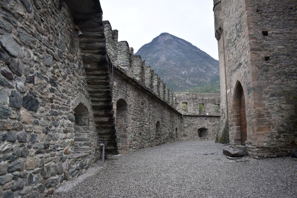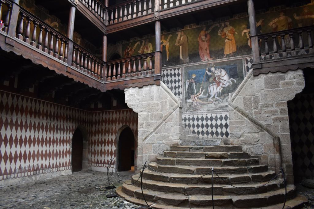 La visita termine nel cortile interno dove è possibile ammirare il meraviglioso scalone semicircolare e gli affreschi che decorano tutto il cortile. Alle spalle dello scalone è presente l’affresco di San Giorgio intento a combattere contro il drago per salvare la principessa. Mentre dalla parte opposta è raffigurato San Cristoforo, protettore dei viaggiatori; da sempre la Valle d’Aosta è stata una terra di passaggio, da qui passa anche la Via Francigena, ed al Castello era quasi sempre presente qualche viaggiatore.