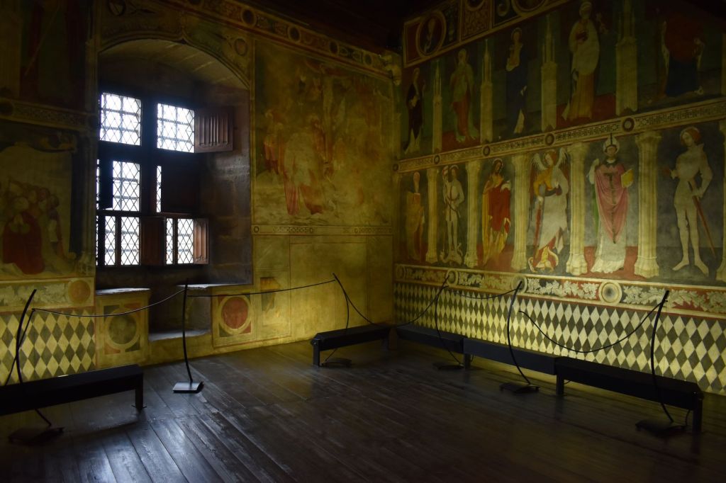 La visita continua nella Chambre Blanche, che nasconde l’accesso ad una piccola torre dalla quale si può vedere l’ingresso al castello, e la Chambre des Gentilshommes, un tempo utilizzata come sala della giustizia, dove si possono notare le modifiche apportate dai vari proprietari al castello ed uno splendido affresco del 1500. Successivamente si passa nella camera da letto, con una splendida vista sul Monte Bianco, e ben isolata grazie ad un’antica bussola. E a concludere la visita del piano nobile la meravigliosa Salle de la Chapelle, la sala più importante di tutto il maniero. Una parte adibita a cappella, è stata completamente affrescata intorno al 1414 da Giacomo Jacquerio. Nell’affresco dedicato alla Madonna sono rappresentati numerosi santi ed alcuni di questi, come si usava fare al tempo, raffigurano i volti dei componenti della famiglia Challant.