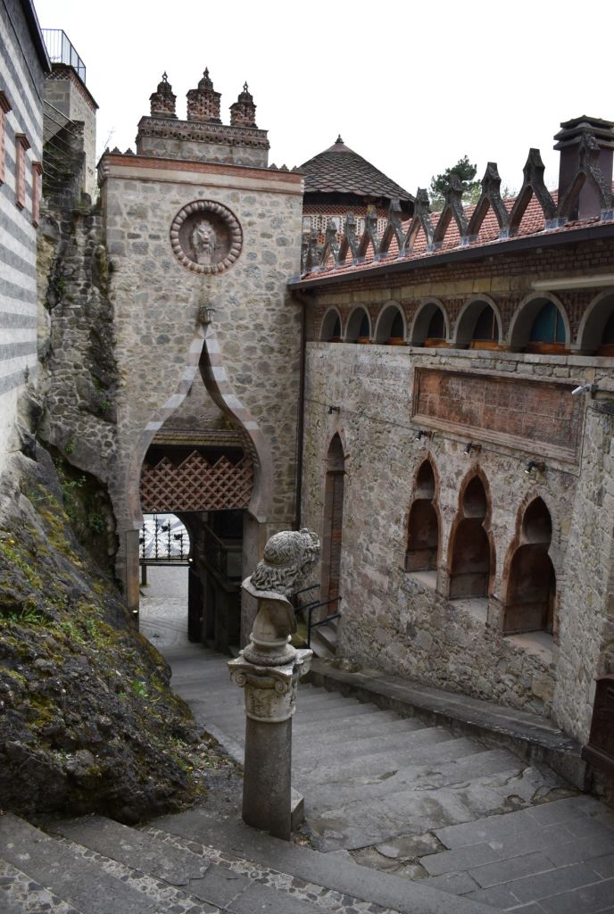 Un altro spazio incredibile della Rocchetta è il Cortile dei Leoni è ispirato al ben più ampio cortile dell’Alhambra di Granada. Anche qui un insieme di più stili, tra l’eclettico e il moresco, sempre con l’utilizzo di materiali locali e facilmente reperibili sul territorio.