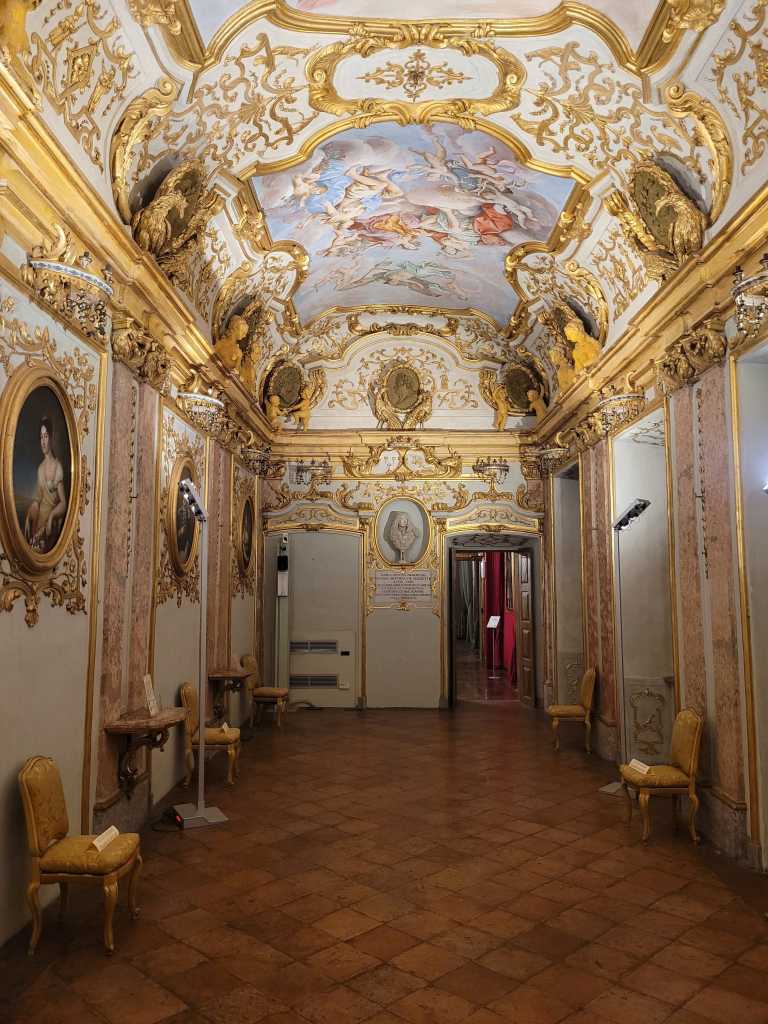 Di incredibile bellezza è la Galleria Mazzetti, toccata in modo ingente dal grande restauro dello scorso decennio, a cui è seguita la riapertura al pubblico nel 2011. Se siete interessati all’argomento vi segnalo inoltre il libro Palazzo Mazzetti ad Asti, a metà tra un volume storico e un saggio edito da Silvana Editoriale, che racconta in modo dettagliato il grande lavoro di valorizzazione e ristrutturazione del palazzo. La Galleria appare raccolta, lussuosa ed elegante, con putti, dipinti allegorici e sfingi.