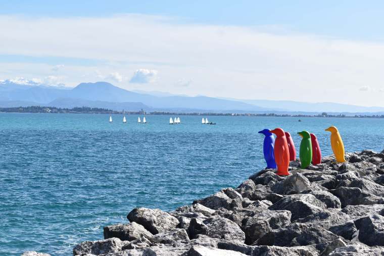 Proprio nei pressi del porto di Desenzano abbiamo fatto la conoscenza di alcuni animaletti colorati, in particolare pinguini, affissi sugli scogli. E in giro per il centro storico ne abbiamo incontrati altri. Sono le opere artistiche temporanee di Cracking Art, che hanno già invaso altre città italiane e capitali mondiali. A Desenzano le installazioni si trovavano in punti diversi della città: Piazza Matteotti, Piazza Malvezzi, Piazza Garibaldi, Lungolago Cesare Battisti e Diga Foranea per un totale di 8 installazioni e 46 sculture.