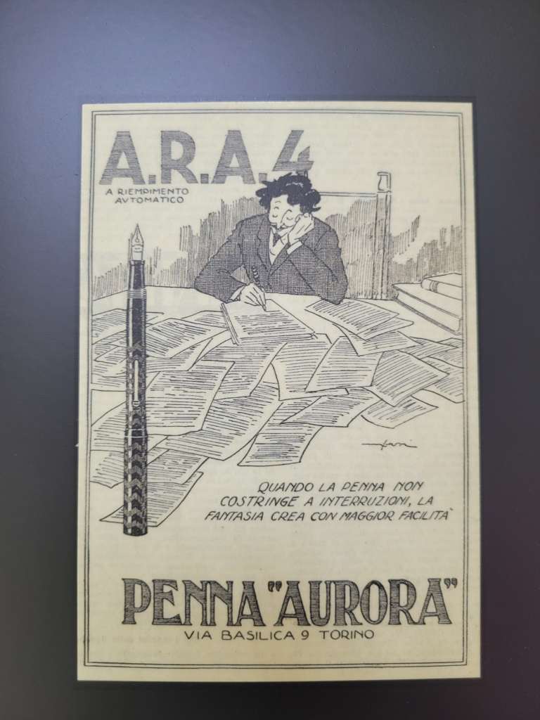 Via via ci si addentra sempre di più nella storia della Manifattura, nelle primissime pubblicità delle Penne Aurora, sezione che io amo sempre molto per stupirmi di quanto sia cambiato il modo di comunicare e “impressionare” il pubblico: le penne Aurora erano perlopiù rivolte a un pubblico di creativi o a bambini e ragazzi in età scolare.