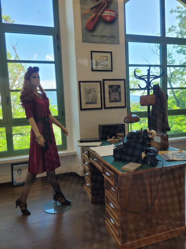 Un’altra sezione che ho adorato è quella degli Uffici storici Aurora in cui è stato riprodotto un ufficio degli anni Venti, con scrivanie, macchine da scrivere e abiti assolutamente originali. Questa parte è una testimonianza del lavoro di ufficio, non solo di Aurora, ma di tutte quelle aziende sviluppatesi nel corso del Novecento. Una scoperta anche olfattiva: dato che questa sezione profuma di iris è violetta, di ambra e mirra.