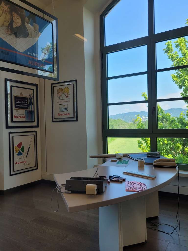 Nella stessa manica dell’edificio, ma al primo piano e con una magnifica vista sulla collina e sulla Basilica di Superga, ho invece iniziato da sola la visita all’Officina della Scrittura, aperta nel 2016 dalla Manifattura Aurora. La visita è ricca di pannelli esplicativi, possibilità di toccare con mano le lenne Aurora e provarle, esperienze immersive che vi catapulteranno anche all’interno dell’inchiostro di una penna.