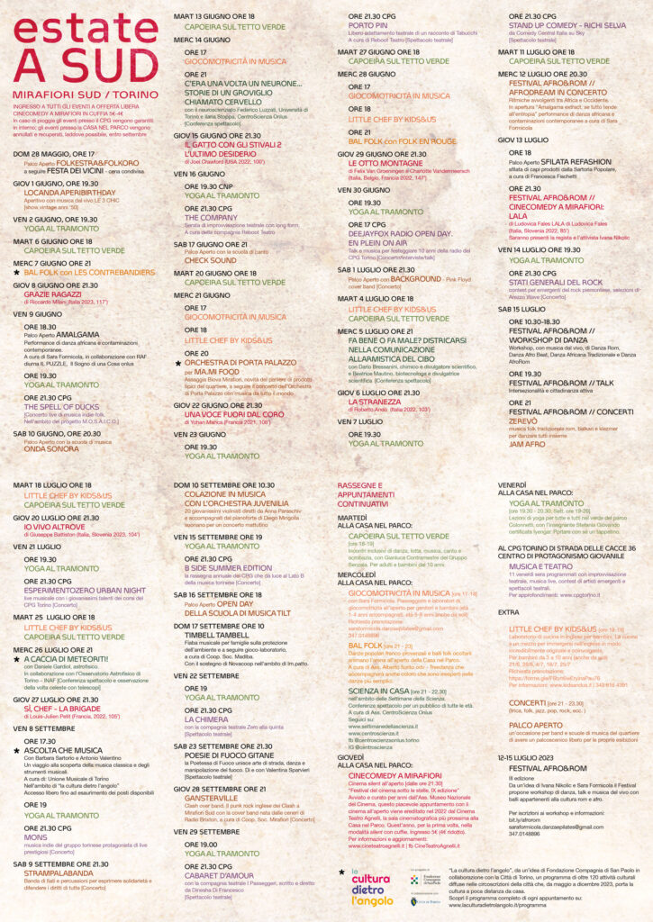 C’è un altro evento a Mirafiori da non perdere, che ha tutta l’aria di volerci occupare tutta la settimana. Si chiama ESTATE A SUD e torna per la IV edizione con oltre 50 appuntamenti dal 1 giugno al 29 settembre, dal mercoledì al sabato. Per quanto riguarda le serata di cinema, presso la Casa nel Parco, tutti i giovedì dall’8 giugno al 27 luglio alle ore 21:30 si potranno vedere al cinema all’aperto otto film a cura del Cinema Agnelli.