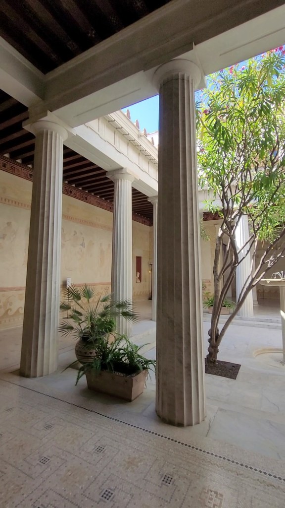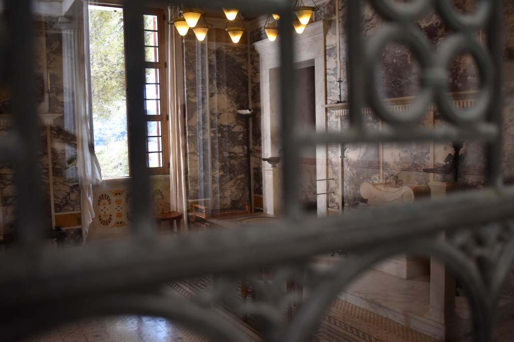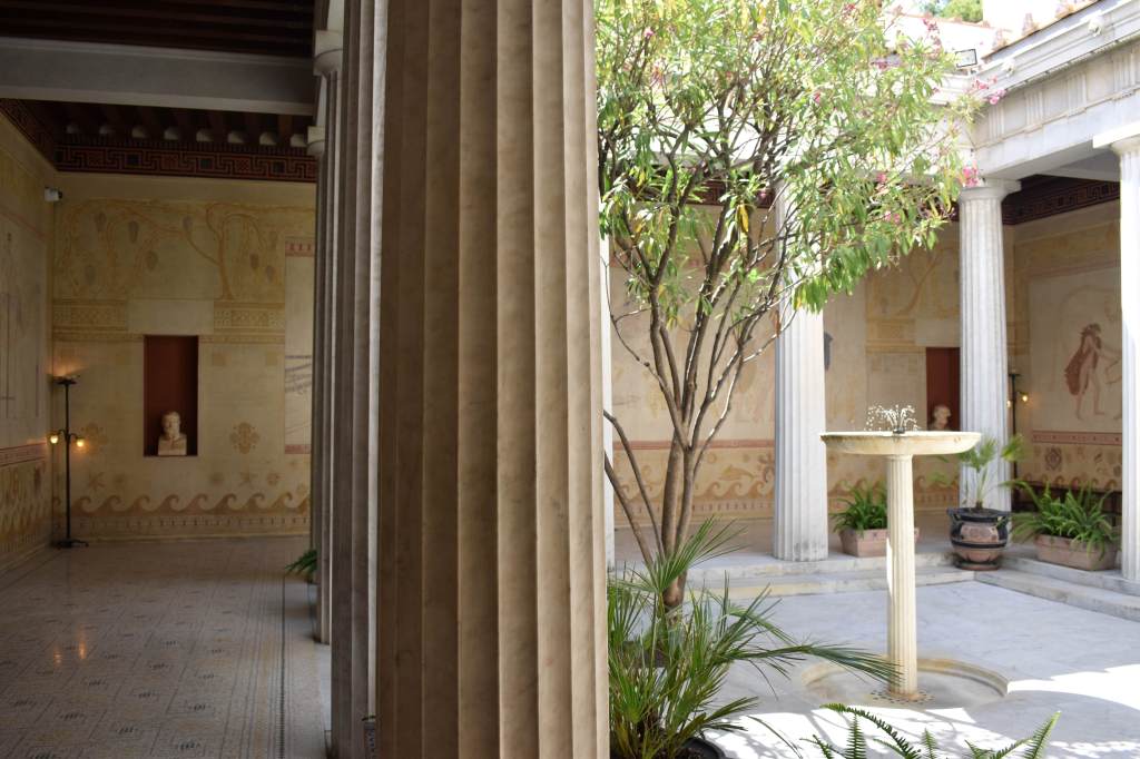 L’architettura greca vorrebbe che tutte le stanze si affacciassero sul cortile interno, non è così per Villa Kérylos, però tutta la casa ruota intorno al Peristilio, circondato da un maestoso colonnato in marmo di Carrara e con al centro un grande oleandro e meravigliosi affreschi su tutte le pareti circostanti, che si ispirano alla mitologia.