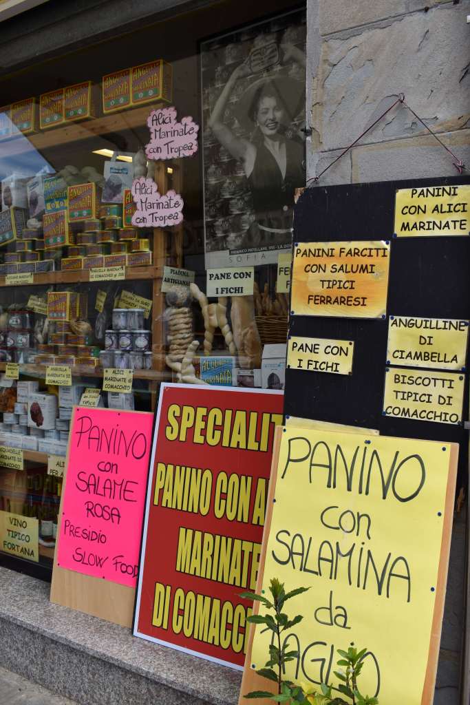 Uno dei punti cardini gastronomici in città è proprio La Bottega di Comacchio, dove abbiamo deciso di dirigerci per pranzo. Approfittando della calda giornata di sole primaverile ci siamo messi in coda aspettando il nostro turno e poi ci siamo sfamati seduti sugli scalini. Il principe del menu è l’originale panino all’anguilla, ideato nel 1986 e servito con la famosa anguilla di Comacchio, a scelta nella versione marinata e affumicata che si può assaggiare nel panino Cavalieri Ducati, nel panino Comacchio e nel panino Duca. Se invece preferite i salumi, potete lanciarvi sulle piadine con salama da sugo o zia ferrarese, un salume proprio di queste parti. Non dimenticatevi che qui preparano l’impasto della piadina alla zucca, davvero buono, per il quale ho scelto di optare.