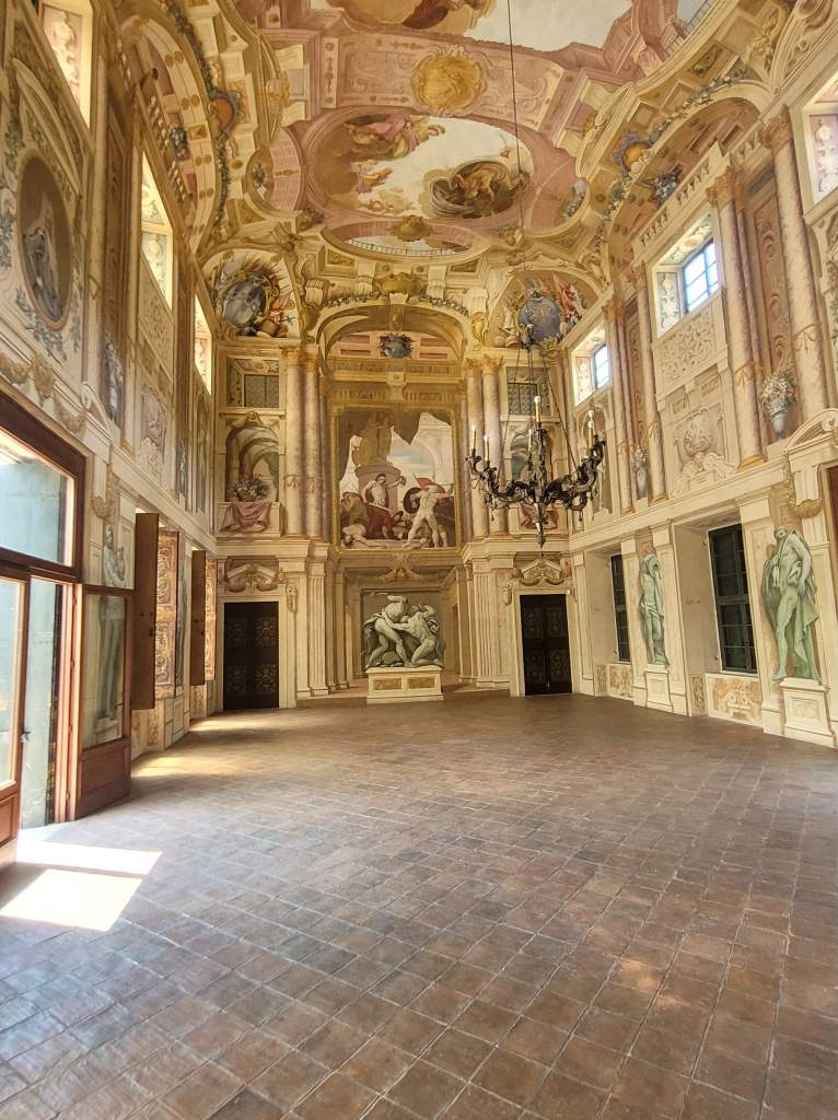 Salendo al primo piano si raggiunge invece l’imponente e scenografico Salone dei Titani interamente affrescato da Louis Dorigny con scene mitologiche e ovviamente i Titani, che sorreggono i dodici segni zodiacali.