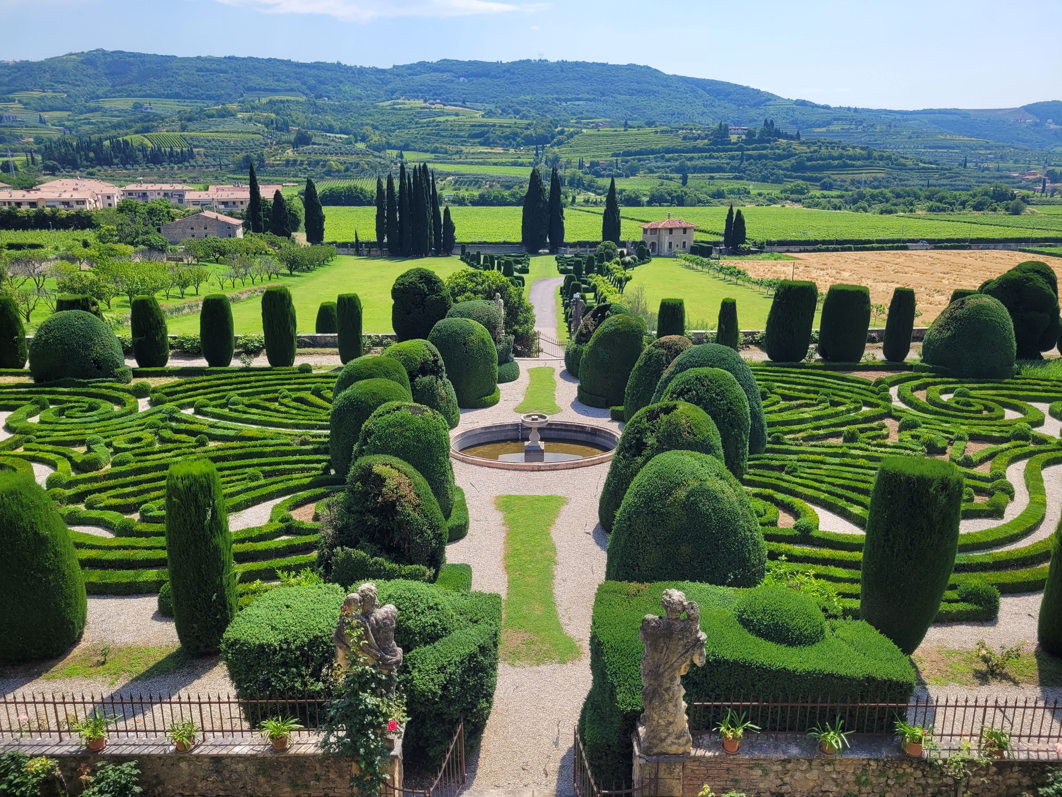 Forse, è proprio affacciandosi dalla balconata del Salone dei Titani che si riesce ad apprezzare al meglio il meraviglioso giardino all’italiana a forma di ventaglio nella sua interezza, unico in Italia, con bossi che hanno più di 300 anni d’età. Le siepi sono potate al fine di formare un disegno elegante e simmetrico al cui centro spicca una fontana.