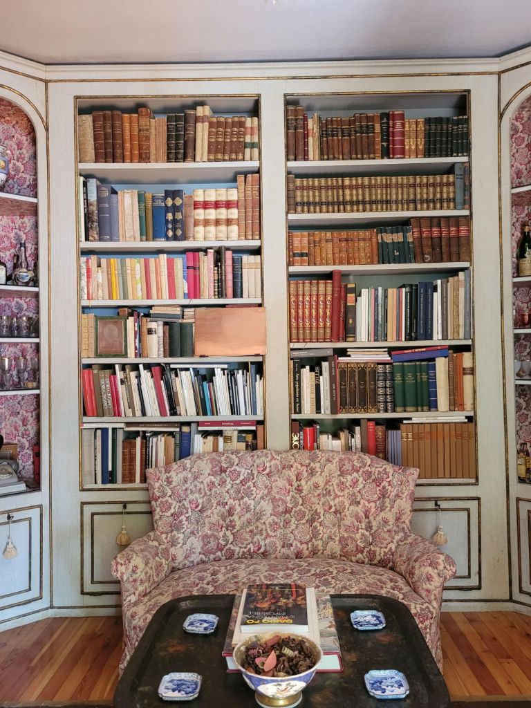 Si entra poi in uno degli ambienti più suggestivi della villa, la biblioteca, dove si trovano ancora oggi i libri di Antonio Fogazzaro e del marchese Giuseppe Roi. Poltroncine e divanetti per leggere comodi con davanti agli occhi la villa sul giardino pensile e il lago che sembra un tutt’uno con il cielo.