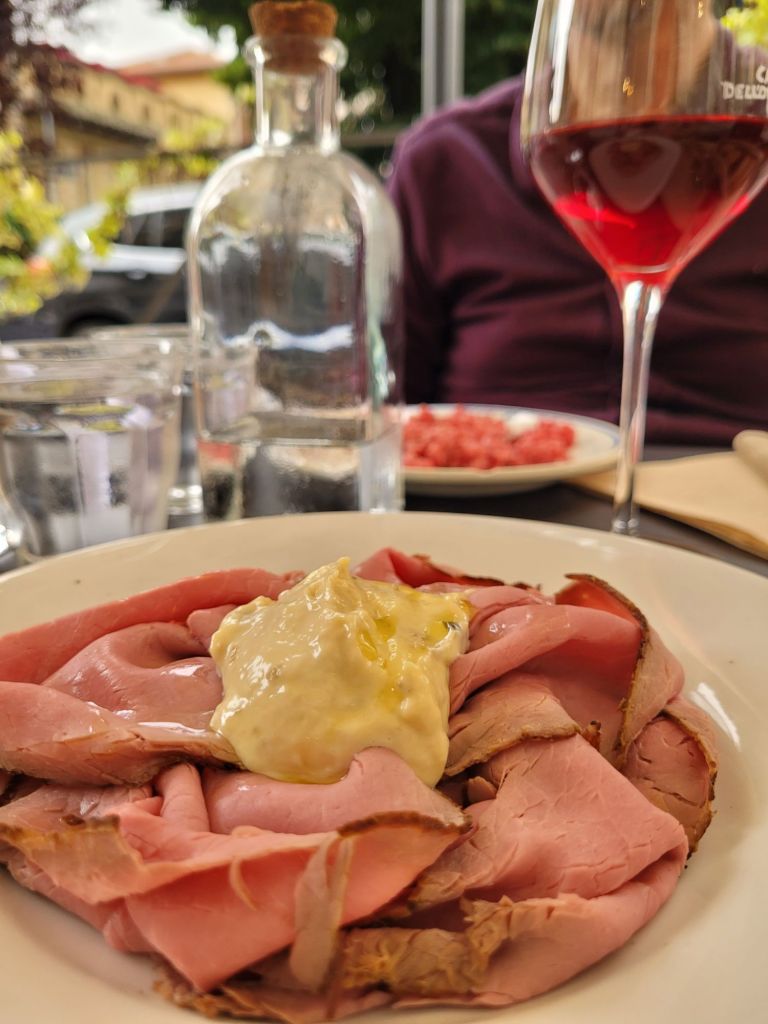 La giornata era stupenda e calda, così abbiamo mangiato fuori nel dehor, comunque in ombra all’ora di pranzo, ed è stato ancora più bello.