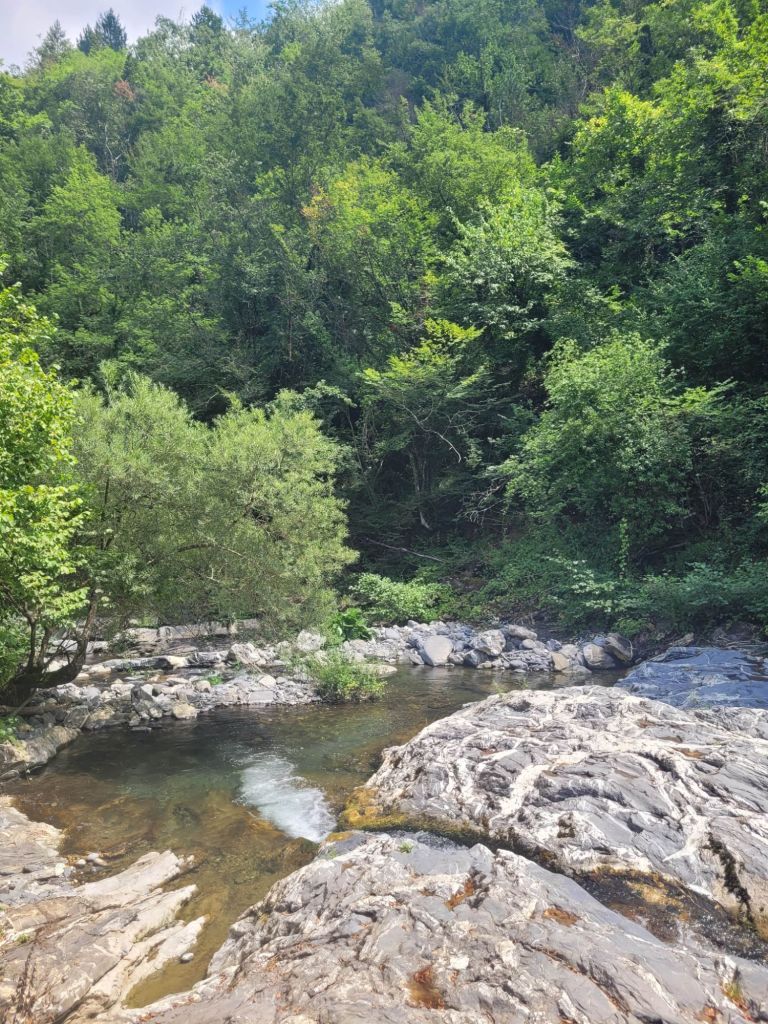 Superato il ponte continuiamo il sentiero, sempre più ombroso e fresco, ormai principalmente in piano. Qui il letto del torrente è basso e roccioso ed è il posto ideale per fermarsi a pranzare senza pericoli.