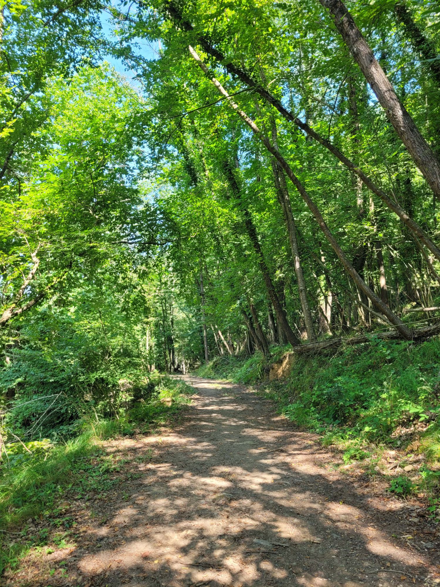 Imboccata la strada sterrata, la discesa è subito decisa e costeggiare alcuni orti; dopo qualche tornante ci troviamo immerse nel bosco e finalmente all’ombra.