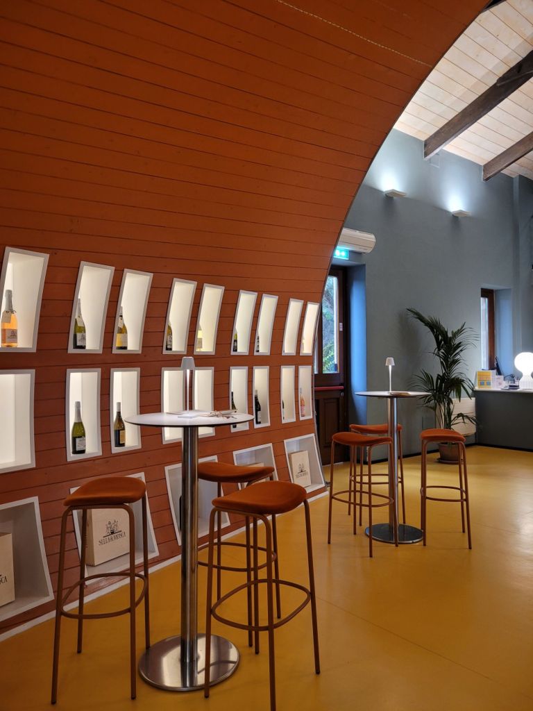 Nulla è lasciato al caso, tutto è frutto di genio e creatività: dallo spazio architettonico che ospita lo shop e chi desidera fare una degustazione e che riprende la forma di una grande botte, agli arredi e all’illuminazione, alle etichette dei vini, ai colori.