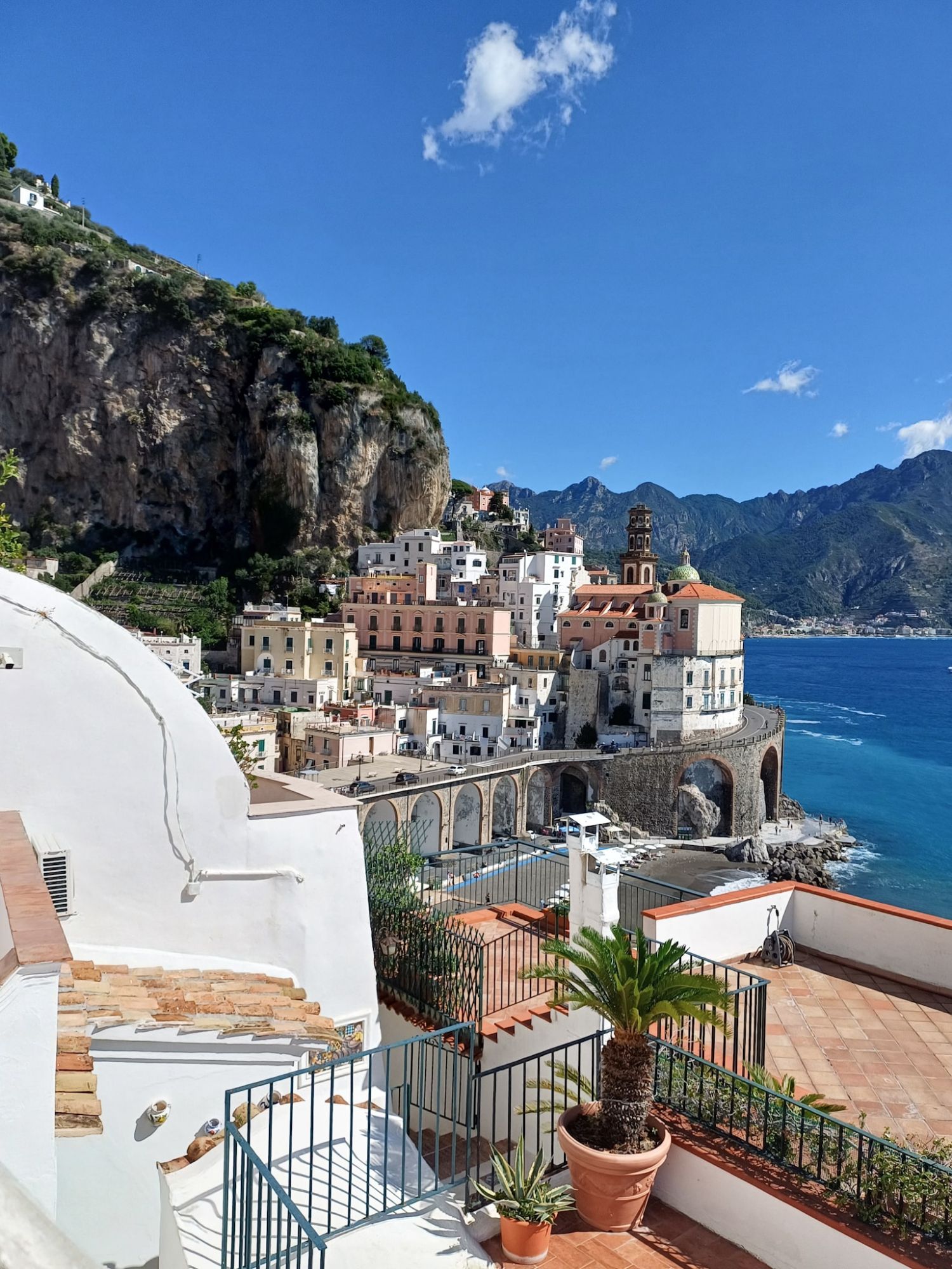 Il cielo è terso e un bel sole caldo scalda tutta la Costiera, vorremmo percorrere il Sentiero degli Dei che collega Agerola a Positano, ma una serie di complicazioni ce lo impediscono. Quindi raggiungiamo Amalfi in traghetto e decidiamo di andare a piedi ad Atrani. Saliamo su per i vicoli in direzione del cimitero di Amalfi e proseguiamo a mezza costa tra incredibili scorci sul mare, che si aprono tra le case. Arriviamo in poco tempo ad Atrani, un vero rifugio per l’anima e la vera scoperta di questo viaggio!