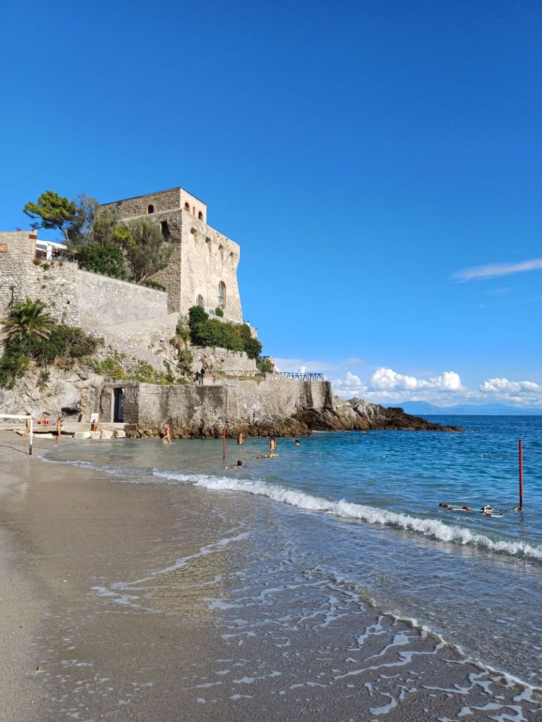 Ripartiamo poi alla scoperta dei vicoli di Amalfi e ci perdiamo nel dedalo di vicoletti e scalinate che si snoda dal Duomo su per il promontorio, in un costante alternarsi di scorci mozzafiato sul mare e sul borgo. Nella tarda mattinata la folla inizia ad accalcarsi tra gli stretti vicoli e decidiamo di allontanarci, concedendoci una breve pausa rigenerante in spiaggia. L’acqua del mare è cristallina e io proprio non resisto alla tentazione di tuffarmi, dopo poche bracciate, voltandomi verso Amalfi, rimango incantata dalla bellezza di questo luogo e quasi non mi sembra possibile essere qui.