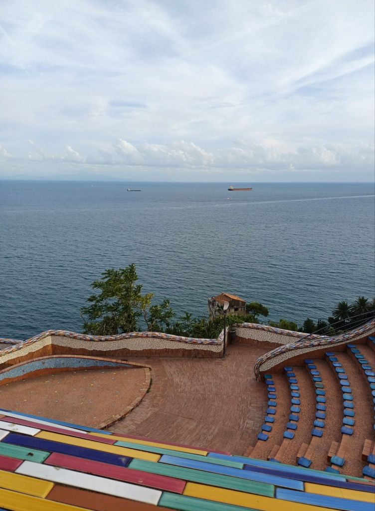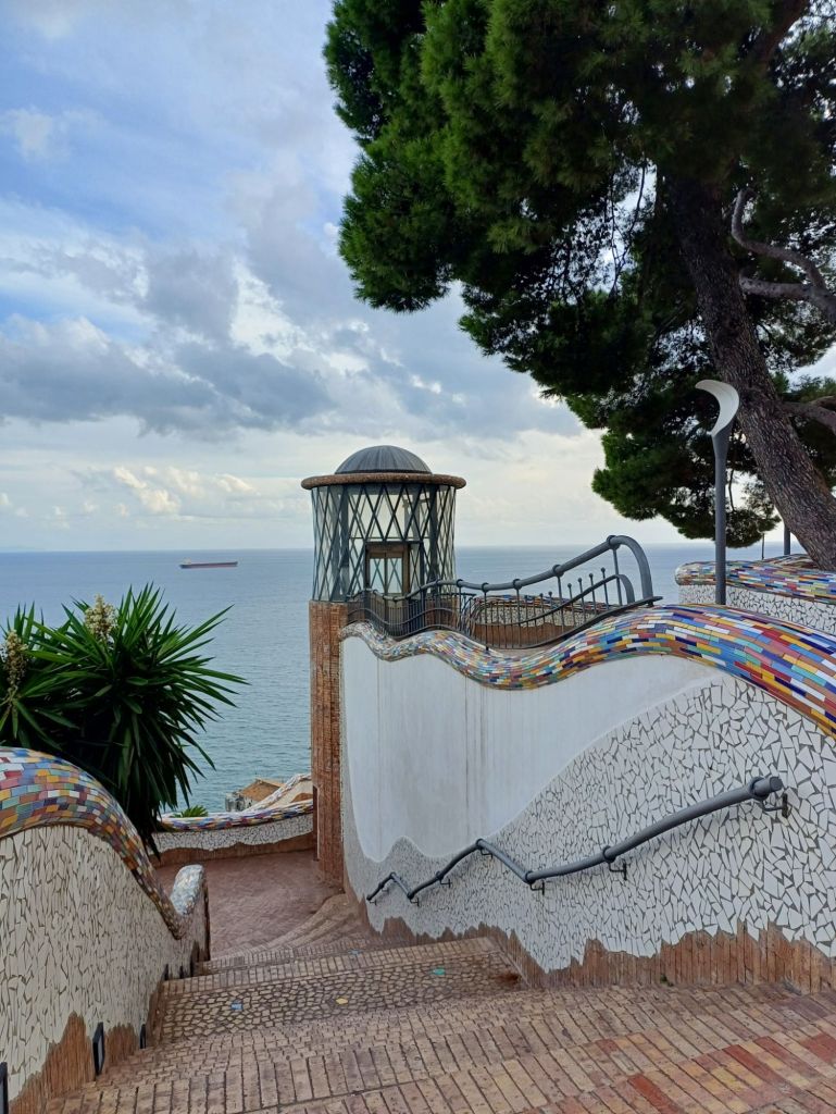 Dopo aver lasciato il cuore in una meravigliosa brocca in ceramica, raggiungiamo il parco Villa Comunale, un giardino incantato dove l’aspra natura della costiera e l’identità artigianale di Vietri si legano indissolubilmente. Quando arriviamo il cielo sopra di noi è grigio, promette pioggia, ed il parco semideserto è avvolto da un’atmosfera cupa che poco lo valorizza, ma man mano che scendiamo lungo le terrazze verso il mare il sole si fa spazio tra le nuvole e come per magia lo illumina con i suoi raggi caldi e ci permette di ammirarlo in tutta la sua bellezza!