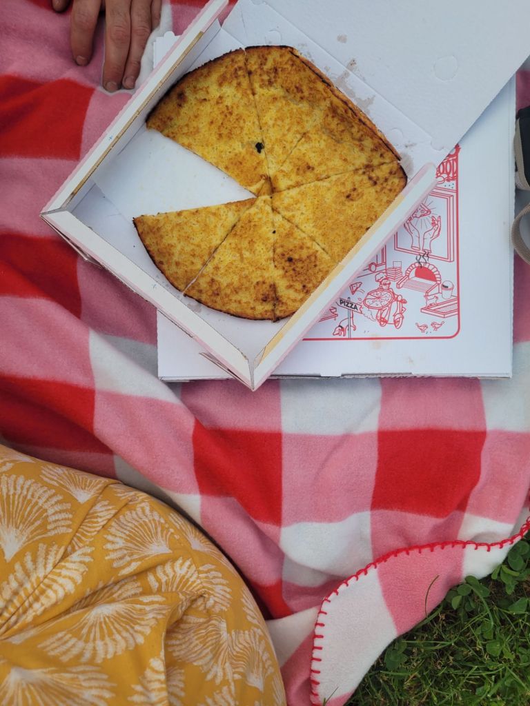 O ancora a mangiare pizza e frutta su un telo in mezzo al prato di un parco cittadino.