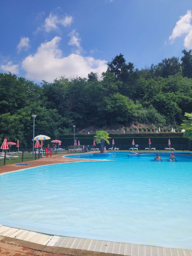 In piscina, tra tuffi, pesciolini galleggianti e schizzi.