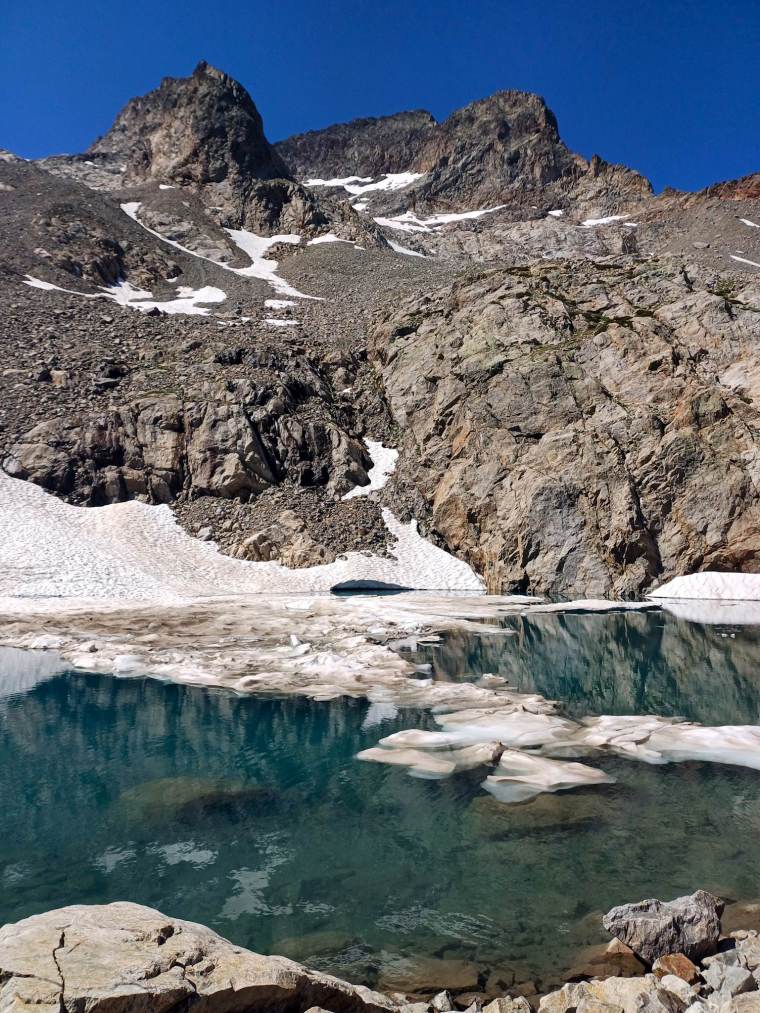 Dopo circa un quarto d’ora si incontra una sorta di bivio, mantenete la sinistra seguendo l’indicazione per “Biv” presente su una roccia. Da qui il sentiero è poco segnalato, dovrete affidarvi alle segnavie rosse. Superati un paio di torrenti, vi attenderà una breve salita accanto alla cascata del Rio Pagarì e in pochi minuti giungerete allo splendido Lago Blu del Gelas. A inizio estate i cumuli di neve galleggiano nel lago e creano un contrasto meraviglioso con le sue acque turchesi.