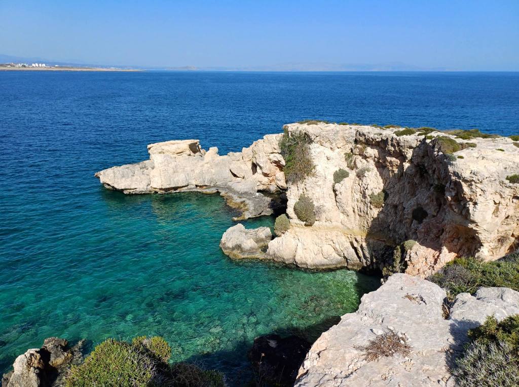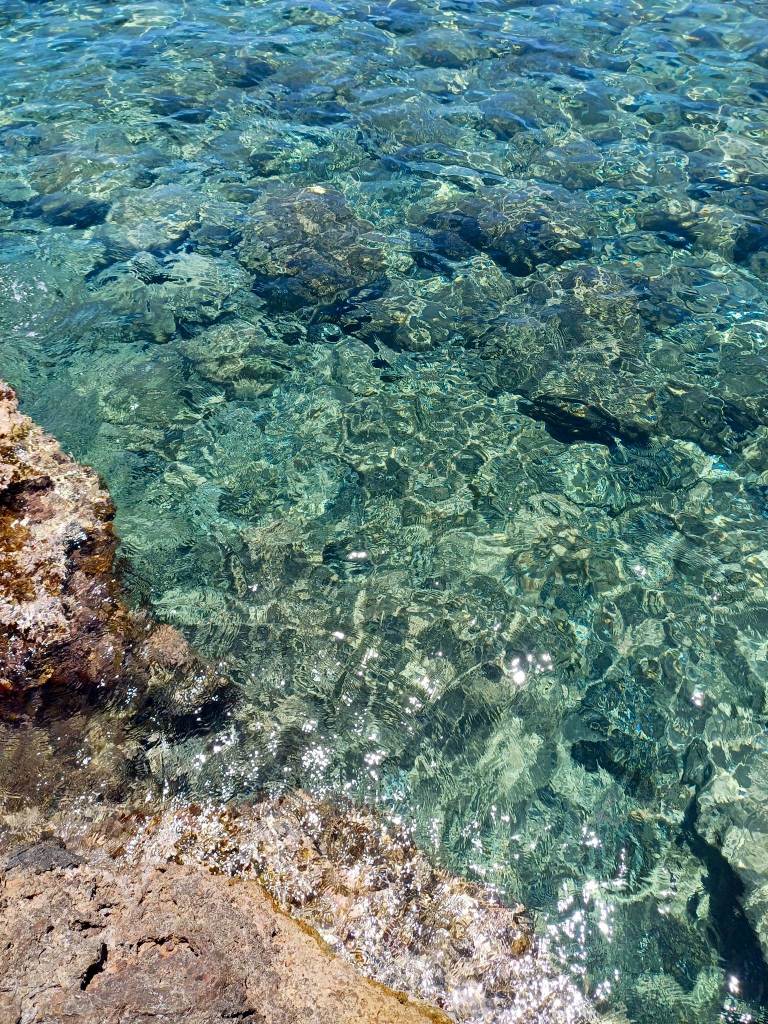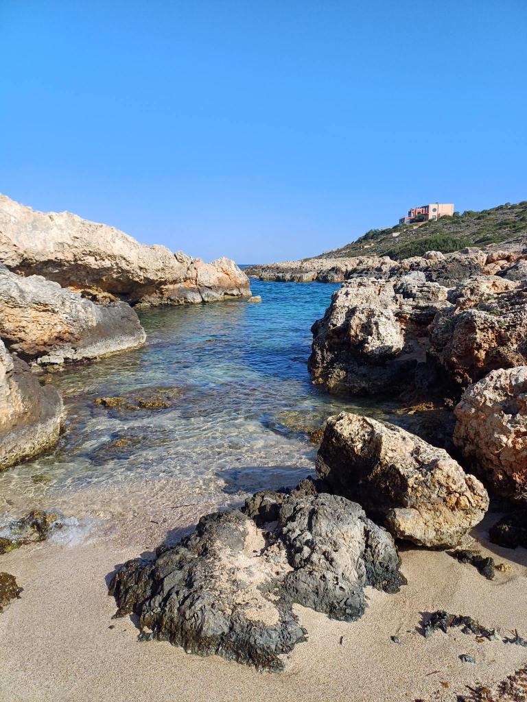 Iniziamo la mattinata con una passeggiata nei dintorni del nostro appartamento. Da google maps avevo notato una piccola baia proprio in corrispondenza del nostro villaggio e, passeggiando poco più in là, troviamo il sentiero per raggiungerla; inutile dire che qualche giorno dopo ho scoperto che c’era un sentiero proprio di fronte al nostro appartamento. Le baie sono due: una prima insenatura con sabbia e acqua cristallina, un vero e proprio angolo di paradiso, e una seconda baia davvero mozzafiato, con alcune grotte, che si può raggiungere via mare che seguendo la scogliera. Obbligatorio portare con sé un costume e la maschera!