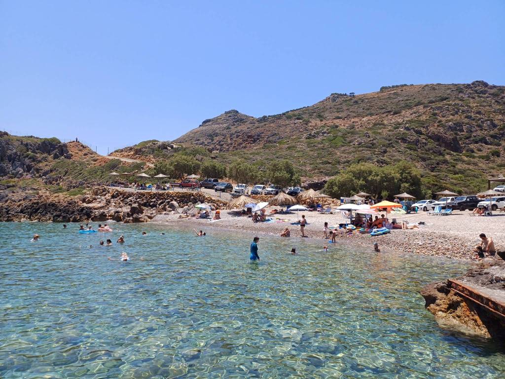 Mentre facciamo colazione, indecisi sul da farsi per la giornata, scoviamo sulla cartina la piccola spiaggia di Afrata, nella penisola di Rodopou. La spiaggia si trova ad una cinquantina di minuti d’auto da noi. Una volta giunti alla penisola percorriamo una splendida strada costiera che conduce al piccolo paese di Afrata, nell’entroterra, immerso in una distesa di ulivi. La strada poi attraversa un canyon di terra rossa e raggiunge la spiaggia. Afrata Beach è una mezzaluna di ciottoli incastonata tra le alte scogliere con un mare cristallino, che pullula di pesci. La spiaggia e la sua taverna sono frequentate dai locali, il clima è disteso e rilassato. Inoltre, la taverna mette a disposizione dei suoi clienti alcuni lettini e ombrelloni gratuiti. Trascorriamo qui l’intera giornata tra bagni e buonissimi caffè frappé.