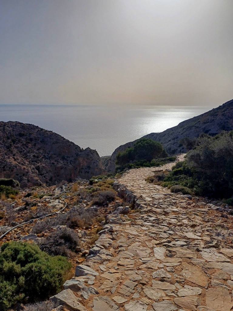 Iniziamo a percorrere il sentiero in completa solitudine e, dopo una ventina di minuti di discesa, raggiungiamo la Grotta Arkoudospilio. La grotta è molto suggestiva e ospita al suo interno alcuni altari. Continuiamo la discesa ma, siccome le temperature si stanno alzando molto velocemente, sono le 9 del mattino e ci sono già 35 gradi, decidiamo a malincuore di non proseguire per paura di trovarci in difficoltà al nostro rientro.