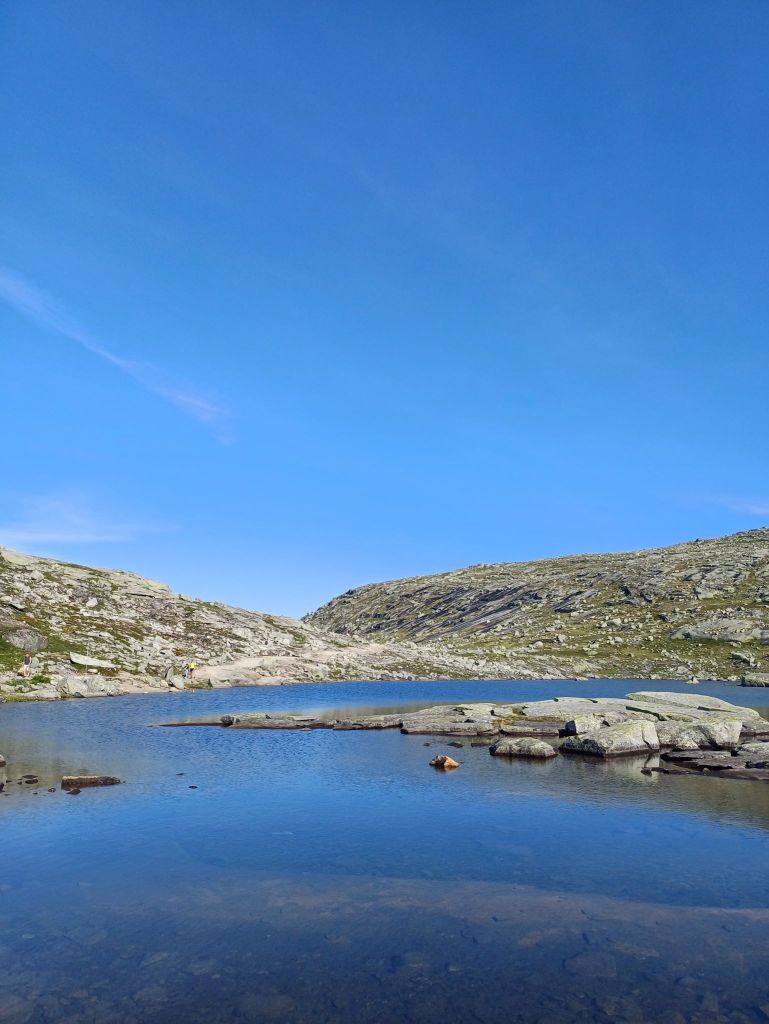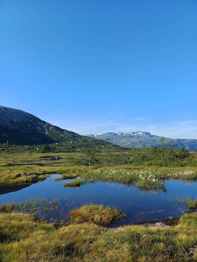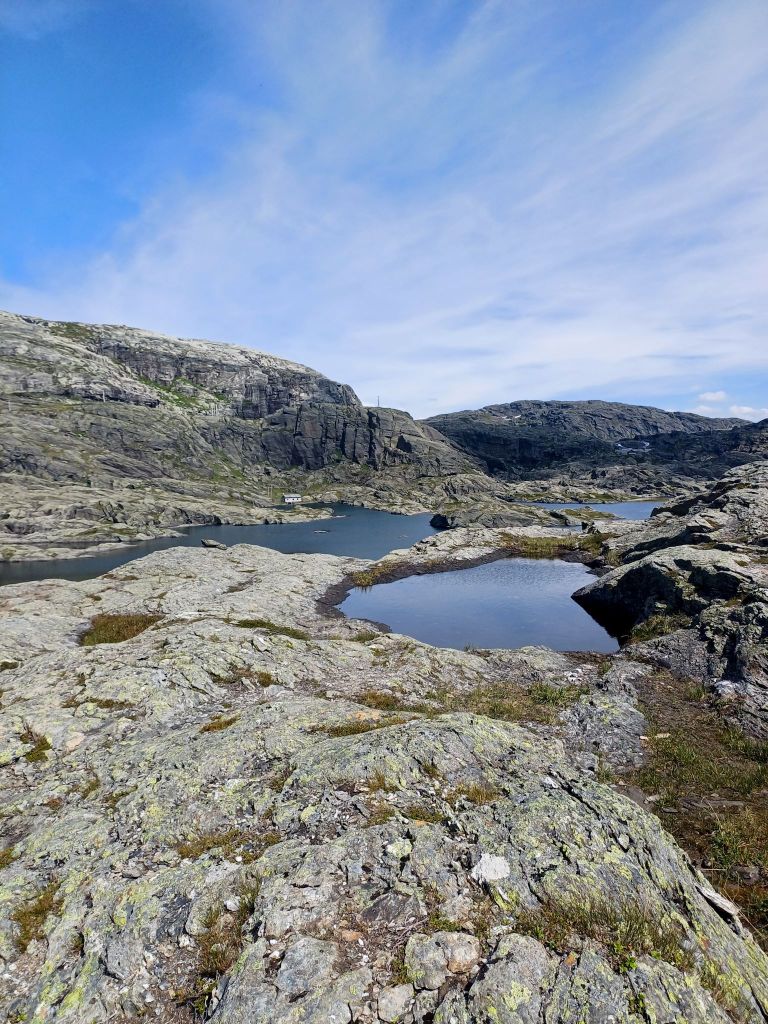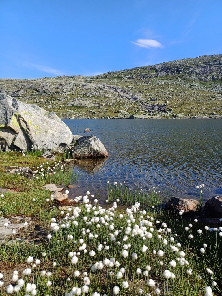 Da questo punto in poi, il sentiero alterna continui sali e scendi. Dopo il Trombeskar si incontra un primo lago circondato da morbidi pennacchi bianchi che danzano al vento. Poi si scende e si attraversa un altro altopiano completamente tempestato da laghi e dove svettano due piccole baite davvero incantevoli. Una delle quali dedicata alle emergenze sanitarie.