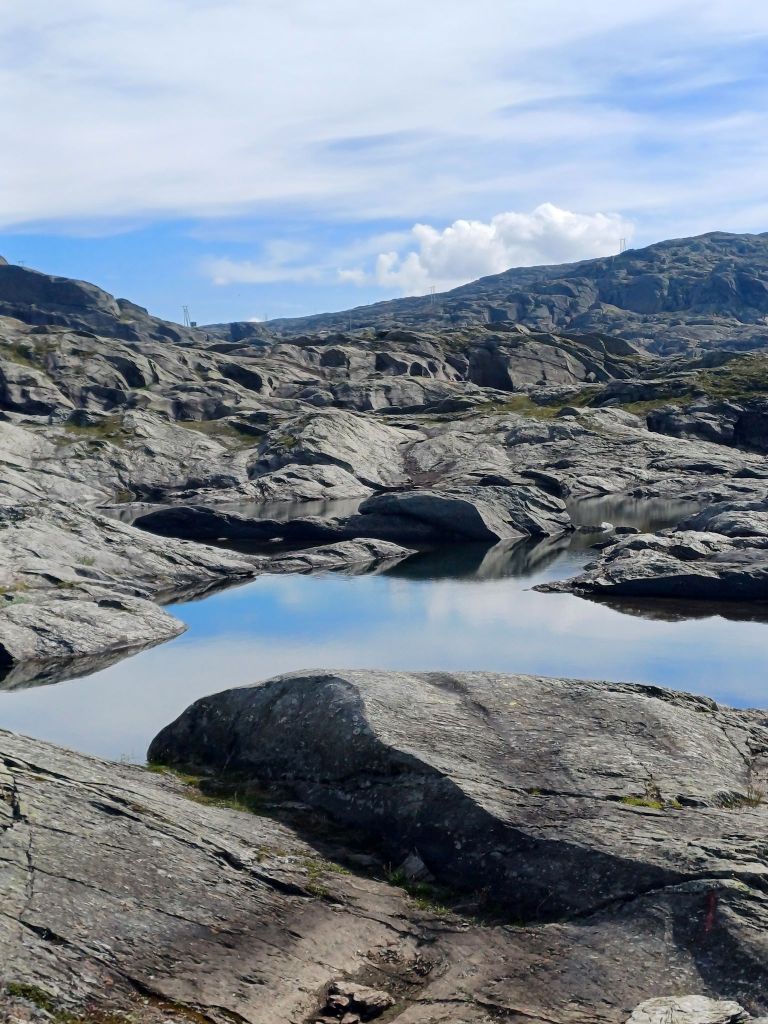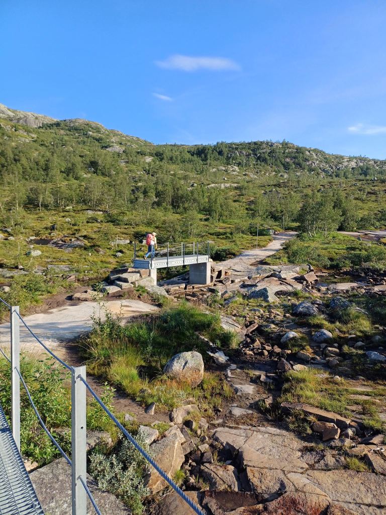 Impieghiamo un po’ più di una mezz’ora d’auto per raggiungere il P2 Skjeggedal. Chiudiamo gli scarponcini e ci mettiamo lo zaino bello carico sulle spalle. Siamo riuscite a prenotare in anticipo la navetta delle 7.30 che dal P2 raggiunge, inerpicandosi su per i tornanti, l’inizio del sentiero, a 800 metri sul livello del mare.