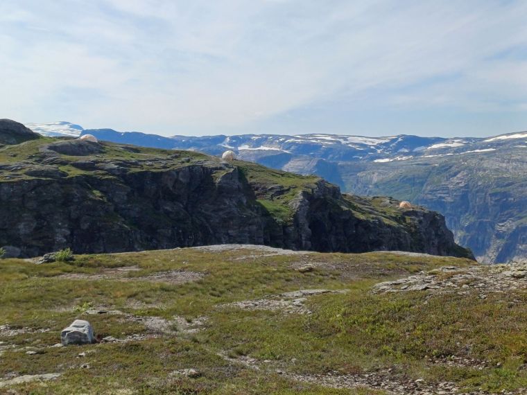 Una volta attraversato l’altopiano, si inizia una salita abbastanza ripida dove al sentiero si alterna una scalinata in pietra, che al termine lascia spazio ad una suggestiva parete in roccia scura, levigata dalla neve, tranquilli nulla di cui preoccuparsi. Qui si raggiunge il Trombeskar a 1160 m slm, uno splendido punto panoramico dove, alle vostre spalle, in lontananza, si può ammirare il Folgefonna, il grande ghiacciaio che sovrasta l’Hardangerfjord.